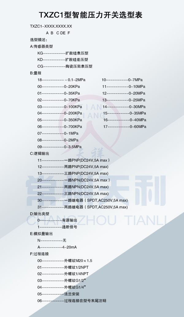 TXZC1型智能壓力開關(guān)基本參數(shù)