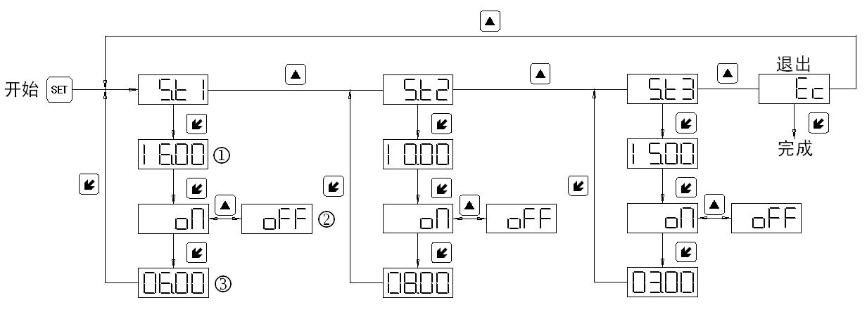 | 基本設(shè)置 | 進(jìn)入基本設(shè)置 | 按“Set”鍵3秒,顯示“ST1”,按“▲”鍵,面板循環(huán)顯示:“ST1”“ST2”“ST3”“Ec”。 |