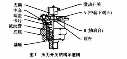 影響限位準確性的誤差因素包括:頂桿的上端面與軸肩臺B之間的加工誤差;中套的下端面A的加工誤差;支架的加工誤差;微動開關(guān)通過支架與中套的裝配誤差及各種形位誤差等。一般情況下,忽略形位誤差的影響,通過尺寸鏈計算。上述各種誤差的積累可使A與B之間的誤差達到正負0.35mm。由于壓力開關(guān)的報警壓力較小,僅為0.08MPa,報警時頂桿的位移僅為0.04mm左右。